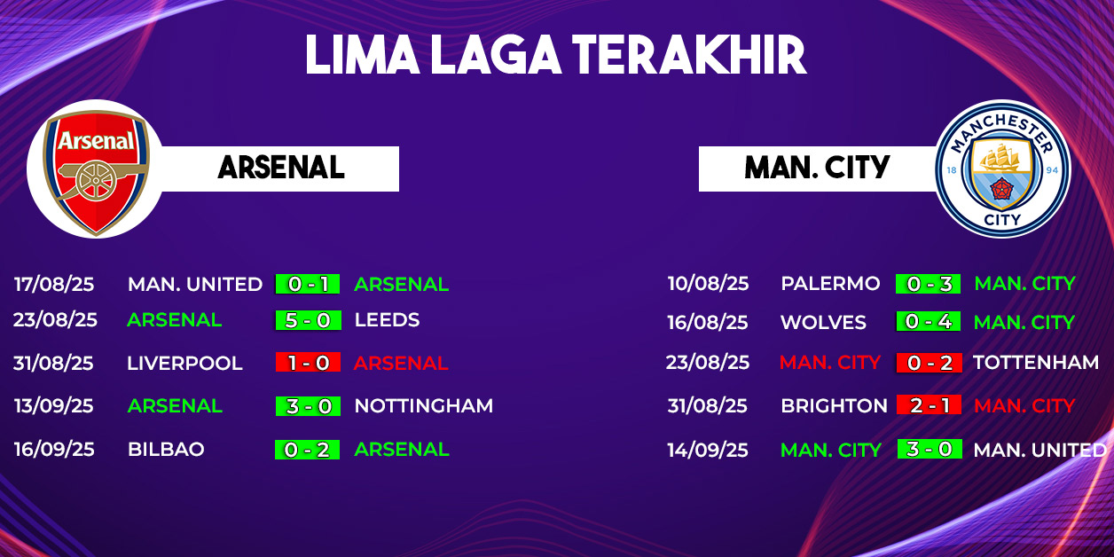 Arsenal di atas angin dengan performa stabil dan dukungan penuh publik Emirates, sedangkan City berusaha bangkit dari tren negatif melawan lawan yang kini menjadi batu sandungan utama mereka.