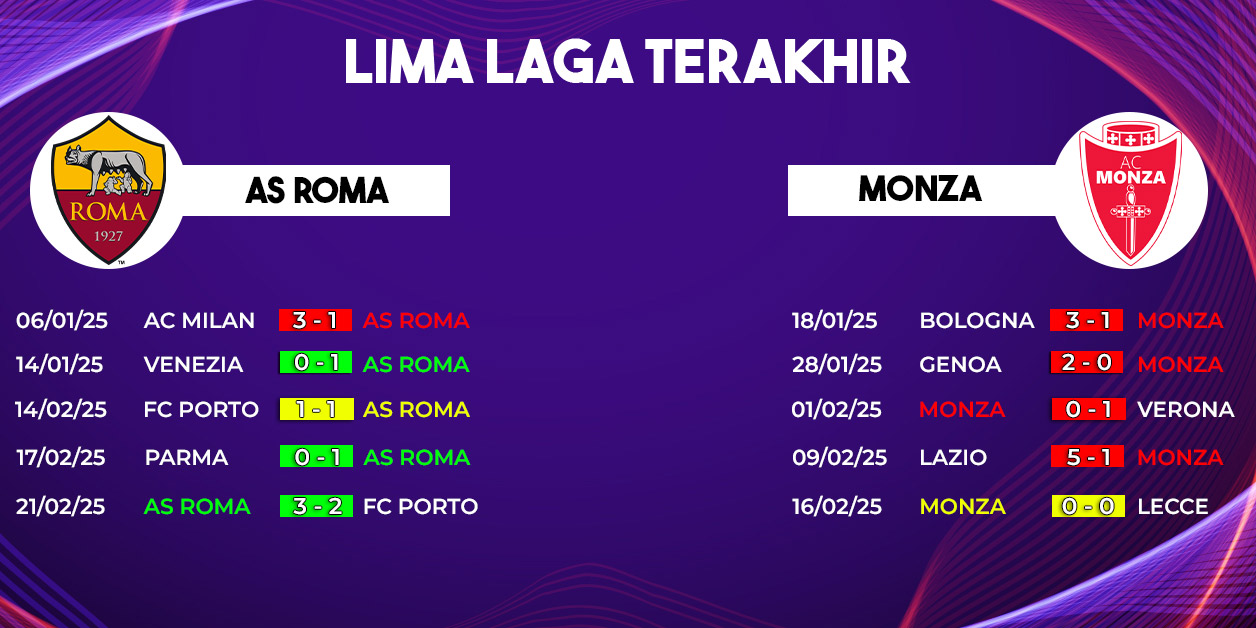 AS Roma menunjukkan dominasi menjelang pertandingan melawan Monza di Olimpico. Tim berjuluk Serigala Ibu Kota ini tidak terkalahkan dalam empat pertandingan terakhir, dengan dua kemenangan beruntun. Pekan lalu, Roma berhasil mengalahkan Parma dengan skor tipis 1-0 di kandang lawan. Selanjutnya, pasukan Claudio Ranieri menundukkan Porto 3-2 di Olimpico, berkat dua gol dari Paulo Dybala dan satu gol dari Niccolo Pisilli.
