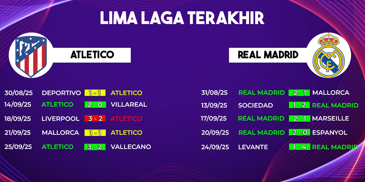 Pertarungan besar akan tersaji pada pekan ke-7 La Liga 2025/2026. Atletico Madrid akan menjamu rival sekota mereka, Real Madrid, di Stadion Riyadh Air Metropolitano pada Sabtu, 27 September 2025, pukul 21.15 WIB. Duel Atletico Madrid vs Real Madrid bukan hanya sekadar laga biasa, melainkan ajang perebutan gengsi serta harga diri. Pertandingan akan disiarkan secara live streaming melalui Vidio.
