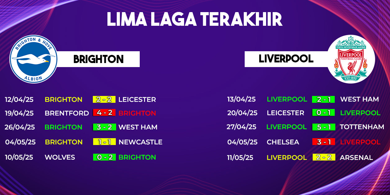 Dalam lima pertandingan terakhir di Premier League, Brighton hanya menelan satu kekalahan. Konsistensi ini menjadikan mereka salah satu tim dengan performa paling stabil di paruh akhir musim. Kemenangan atas Wolves menjadi momentum penting yang dapat mereka bawa saat menjamu Liverpool, yang justru tengah dalam tren penurunan performa.