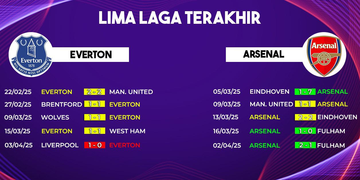 Arsenal memang datang dengan rekor tandang yang mengesankan, namun Goodison Park bukanlah tempat yang mudah mereka taklukkan. Dalam beberapa tahun terakhir, Everton sempat tak terkalahkan dalam lima laga kandang beruntun melawan Arsenal, meski akhirnya rekor itu terhenti musim lalu.