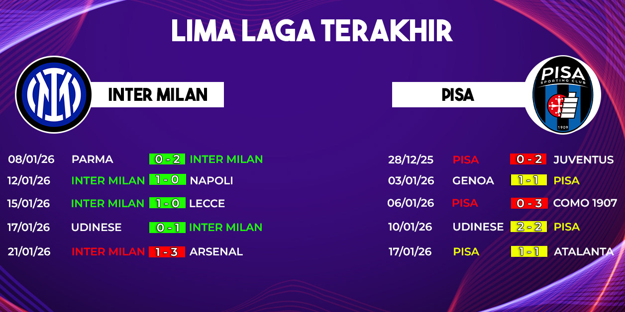 Dari sisi head to head, Inter Milan jelas berada di atas angin. Dalam enam pertemuan terakhir melawan Pisa di semua kompetisi, La Beneamata selalu keluar sebagai pemenang. Bahkan, Inter belum pernah merasakan kekalahan dari Pisa sejak tahun 1987.