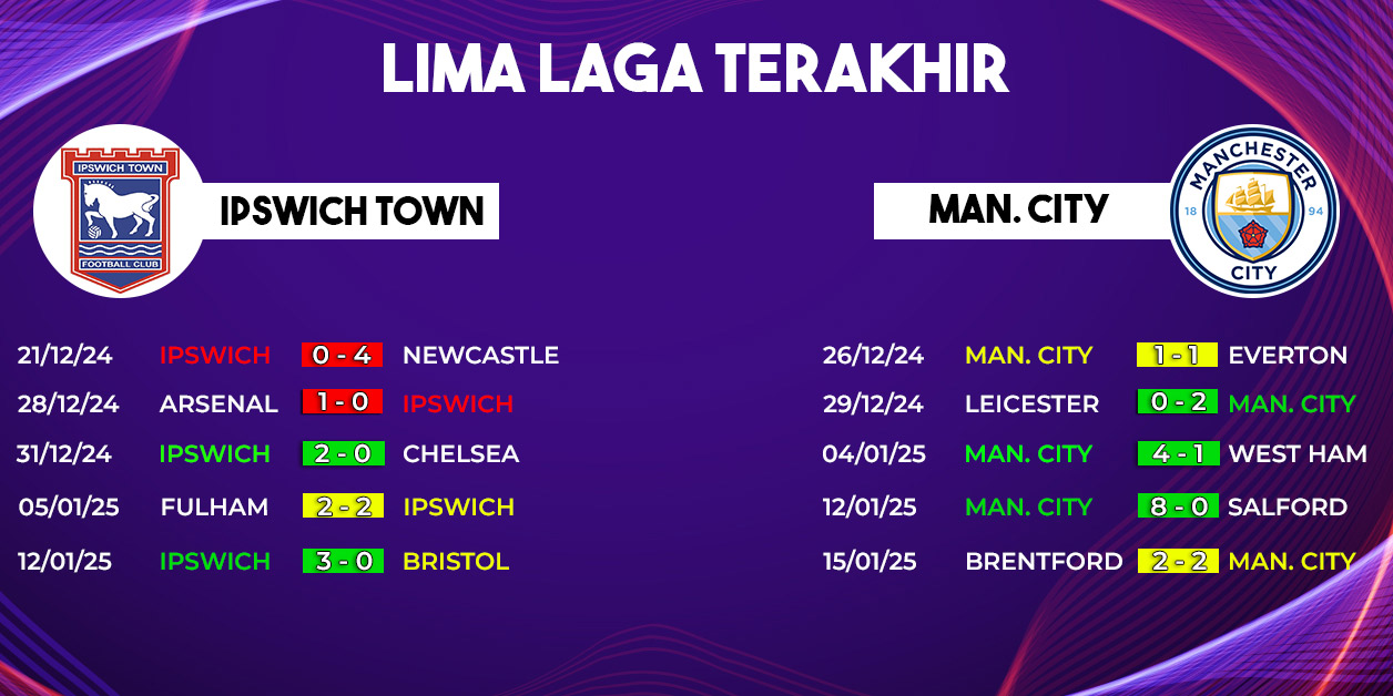 Pada pertemuan sebelumnya, Manchester City sukses menghancurkan Ipswich Town dengan skor 4-1. Dalam laga tersebut, Erling Haaland mencetak hat-trick, sementara satu gol lainnya disumbangkan oleh Kevin De Bruyne. Kemenangan tersebut menjadi bukti superioritas The Citizens atas Ipswich.