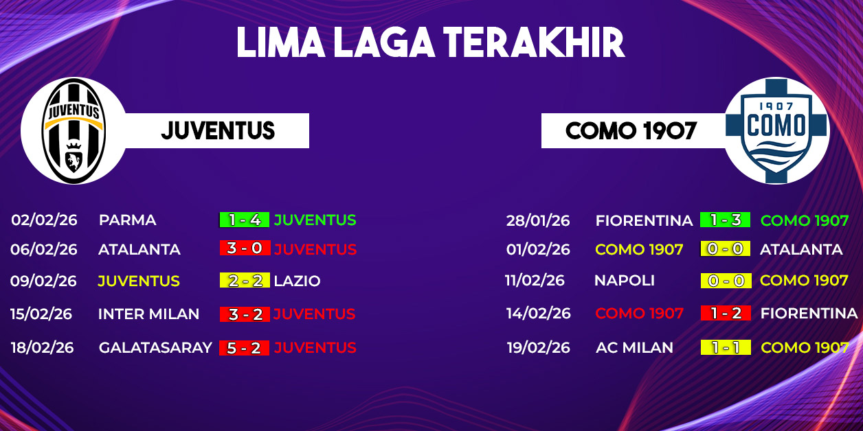 Juventus diprediksi mencetak gol melalui skema open play dan bola mati, sementara Como akan kesulitan menembus pertahanan solid tuan rumah. Dengan performa yang lebih konsisten dan komposisi tim yang lebih matang, kami menilai Juventus sangat difavoritkan meraih kemenangan meyakinkan pada pertandingan Liga Italia 21 Februari 2026 ini.