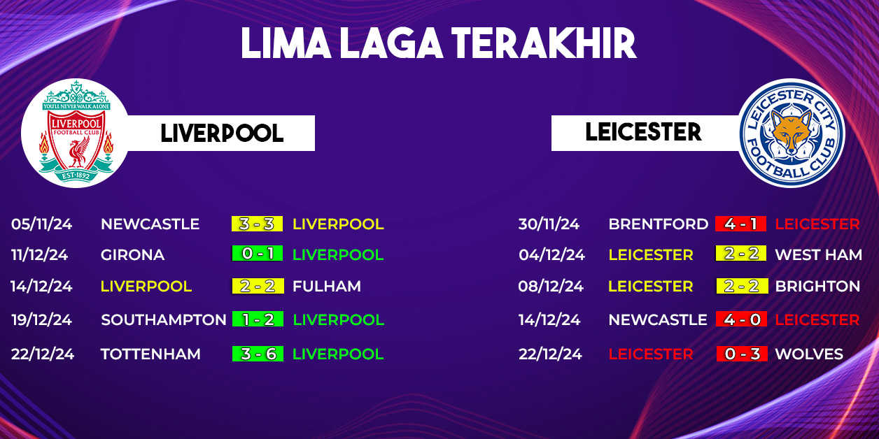 Leicester hanya mampu bermain imbang 2-2 melawan Brighton di kandang, sebelum mengalami kekalahan telak 0-4 dari Newcastle dan 0-3 dari Wolverhampton. Penurunan performa ini menjadi tantangan besar bagi Leicester, terutama saat harus menghadapi Liverpool yang sedang dalam performa terbaiknya.