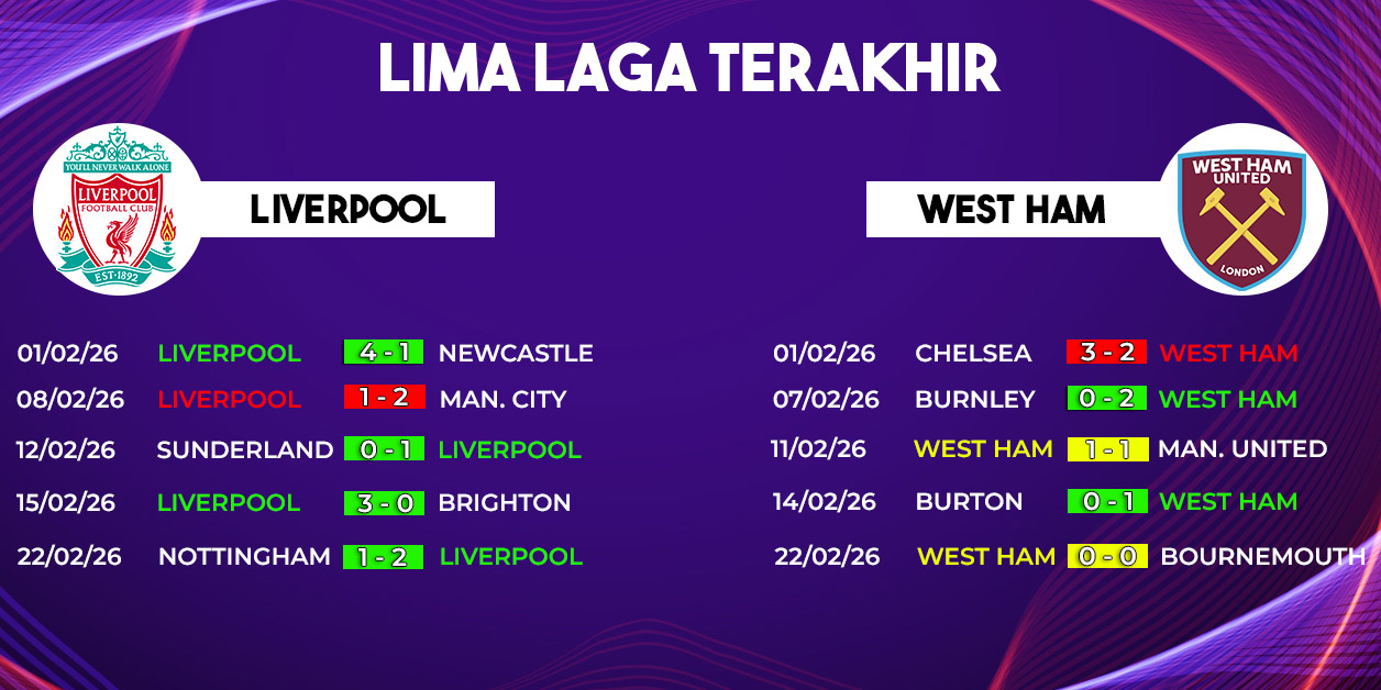 Pertandingan big match pekan ke-28 Liga Inggris 2025–2026 mempertemukan Liverpool melawan West Ham United pada 28 Februari 2026 di Stadion Anfield, Inggris. Duel Liverpool vs West Ham menjadi momen penting bagi kedua tim dalam mencapai target musim ini — Liverpool yang ingin meraih posisi lebih tinggi di klasemen, serta West Ham yang berjuang keluar dari zona degradasi.