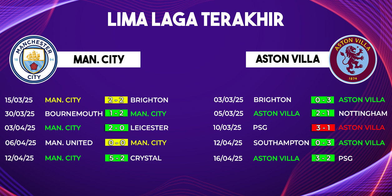 Manchester City dan Aston Villa saat ini berada dalam posisi ideal. Keduanya meraih kemenangan penting pada laga sebelumnya—City mengatasi Everton dengan skor 2-0, sementara Villa membantai Newcastle 4-1. Kemenangan tersebut menjaga asa keduanya untuk finis di zona empat besar, atau bahkan lima besar, demi mengamankan slot ke Liga Champions.