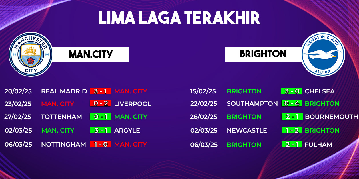 Brighton datang ke Etihad dengan modal yang sangat kuat. Mereka telah mencatatkan enam kemenangan beruntun di semua kompetisi, menjadikan mereka lawan yang tidak bisa dianggap remeh oleh Manchester City.