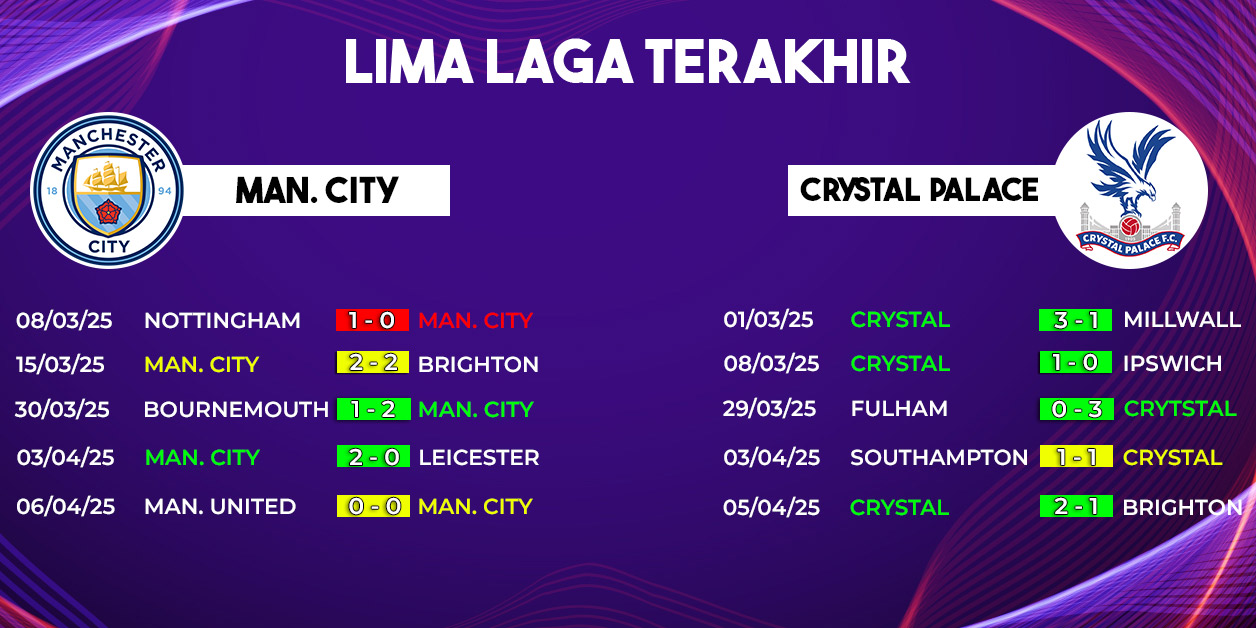 Pertarungan antara Manchester City vs Crystal Palace pada pekan ke-32 Premier League 2024/2025 menjadi sorotan utama akhir pekan ini. Laga Manchester City vs Crystal Palace akan digelar di Etihad Stadium pada hari Sabtu, 12 April 2025 pukul 18.30 WIB dan dapat disaksikan melalui live streaming di Vidio. Kedua tim datang dengan motivasi berbeda namun sama-sama memiliki kepentingan besar menjelang akhir musim.