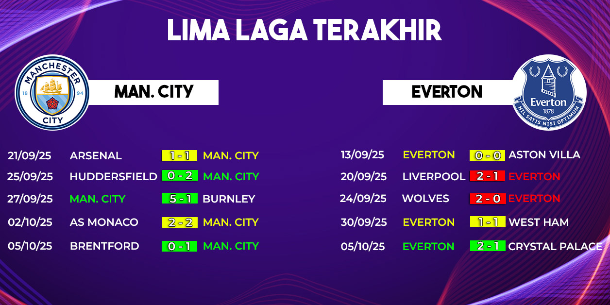 Pertandingan Manchester City vs Everton pada pekan ke-8 Premier League 2025/2026 menjanjikan duel menarik antara dua tim dengan ambisi besar. City berupaya mempertahankan rekor tak terkalahkan dan mendominasi klasemen, sementara Everton ingin membuktikan diri sebagai tim yang mampu bersaing dengan klub papan atas.