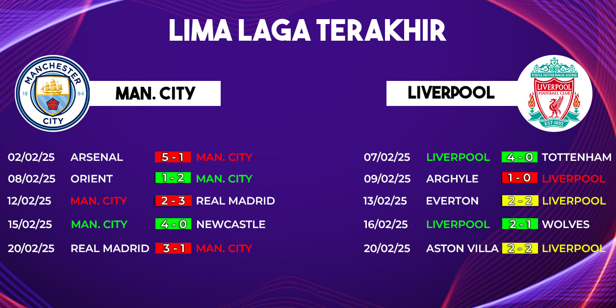 Manchester City vs Liverpool akan berhadapan dalam laga panas pekan ke-26 Premier League 2024/2025. Pertandingan yang digelar di Etihad Stadium ini dijadwalkan berlangsung pada Minggu, 23 Februari 2025, pukul 23.30 WIB. Duel seru ini dapat disaksikan secara langsung melalui SCTV dan live streaming di Vidio.