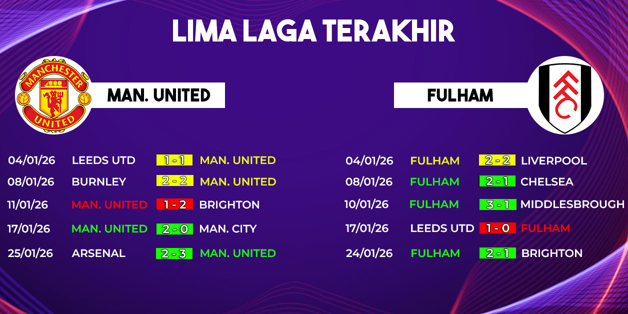 Manchester United memang memiliki rekor kandang yang lebih baik, namun Fulham tidak jarang mampu mencuri hasil positif di Old Trafford. Statistik pertemuan ini menegaskan bahwa laga pekan ke-24 Premier League 2025/2026 berpotensi berjalan sengit sejak menit awal hingga peluit akhir.
