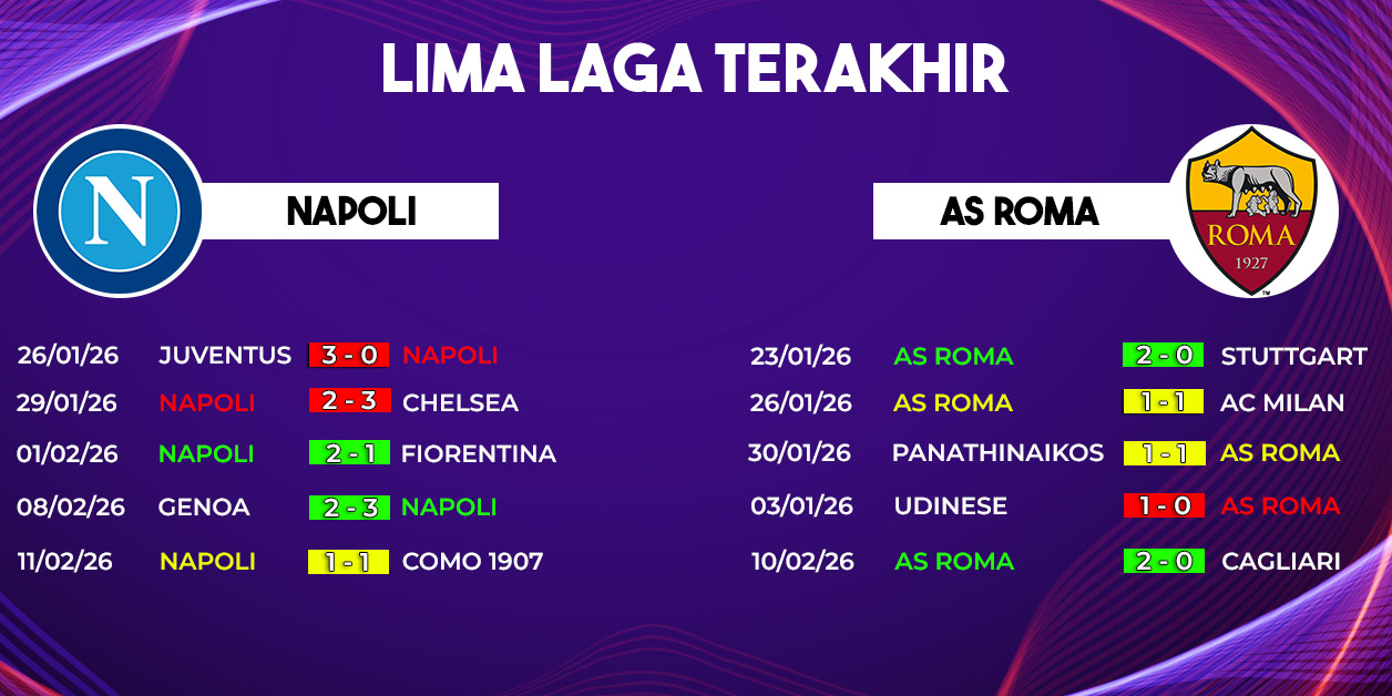 Stadion Diego Armando Maradona akan menjadi arena pertempuran sengit saat Napoli menjamu AS Roma pada Senin dini hari, 16 Februari 2026. Laga Napoli vs AS Roma di pekan ke-25 Serie A musim 2025/2026 ini membawa kepentingan besar bagi kedua tim; Napoli berusaha menjaga asa meraih Scudetto, sementara AS Roma berjuang keras untuk mengamankan posisi di zona Liga Champions.