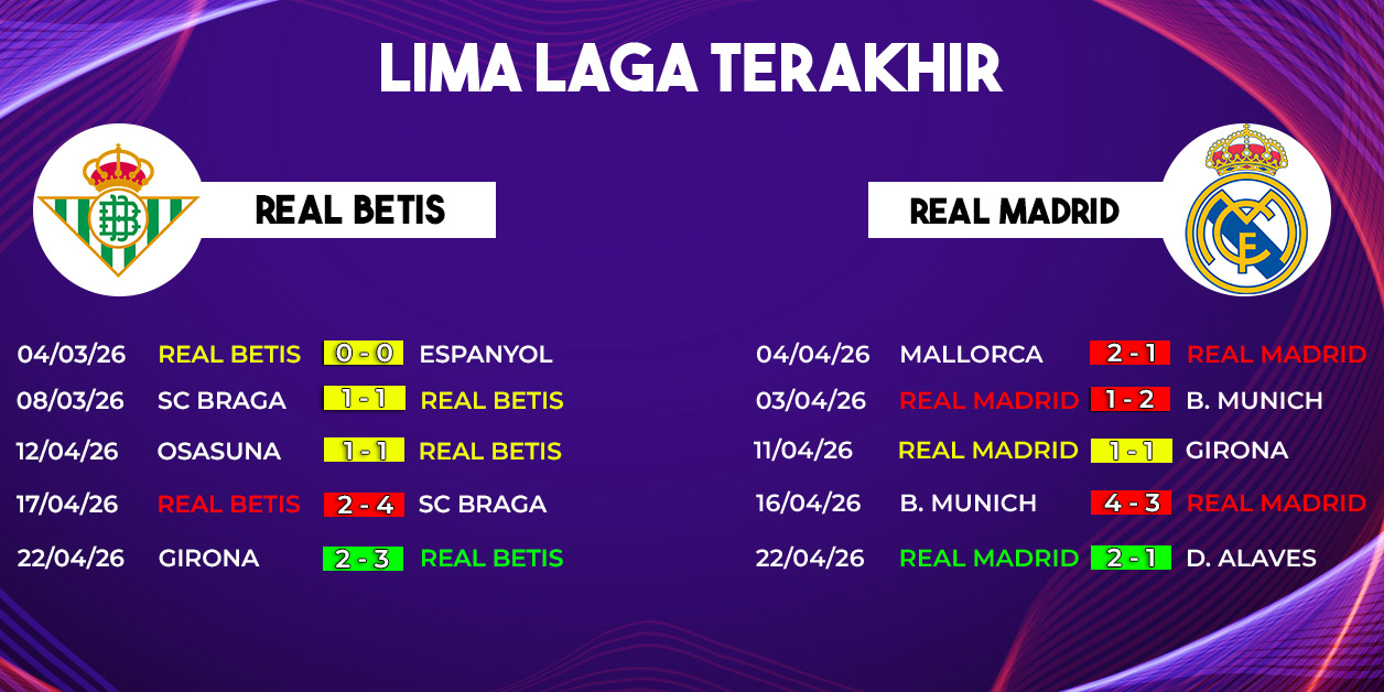 Pertandingan antara Real Betis vs Real Madrid pada tanggal 25 April 2026 dipastikan menjadi salah satu duel paling menarik dalam lanjutan Liga Spanyol musim ini. Kami melihat bahwa kedua tim datang dengan ambisi besar, di mana Real Madrid masih berjuang menjaga posisi puncak klasemen, sementara Real Betis berupaya mengamankan tiket kompetisi Eropa.