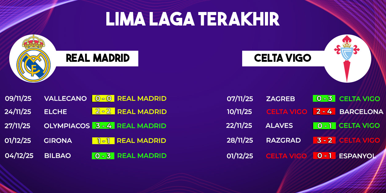 Pertandingan seru Real Madrid vs Celta Vigo pada pekan ke-15 La Liga 2025/2026 dipastikan akan menyita perhatian publik pecinta sepak bola Spanyol. Laga yang digelar di Santiago Bernabeu ini dijadwalkan kick-off pada Senin, 8 Desember 2025, pukul 03.00 WIB, dan dapat disaksikan melalui live streaming di Vidio.
