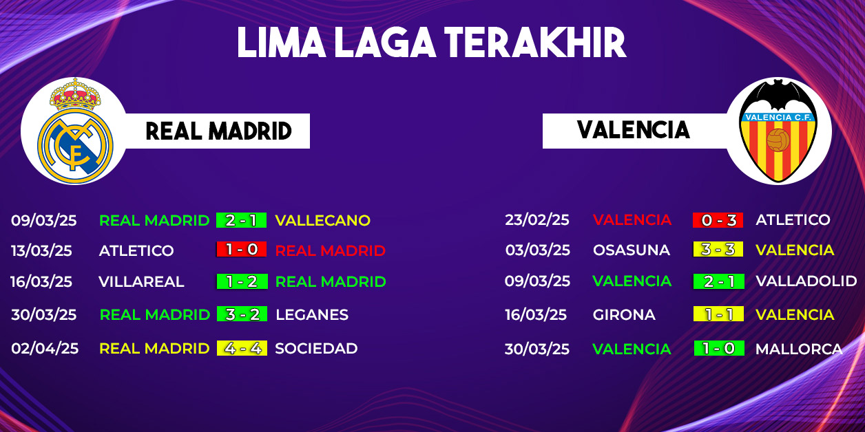 Dalam lima pertemuan terakhir kedua tim di semua ajang, Madrid mendominasi dengan empat kemenangan dan satu hasil imbang. Statistik ini tentu menjadi beban psikologis tambahan bagi Valencia, tetapi juga menjadi motivasi untuk mematahkan dominasi tersebut.