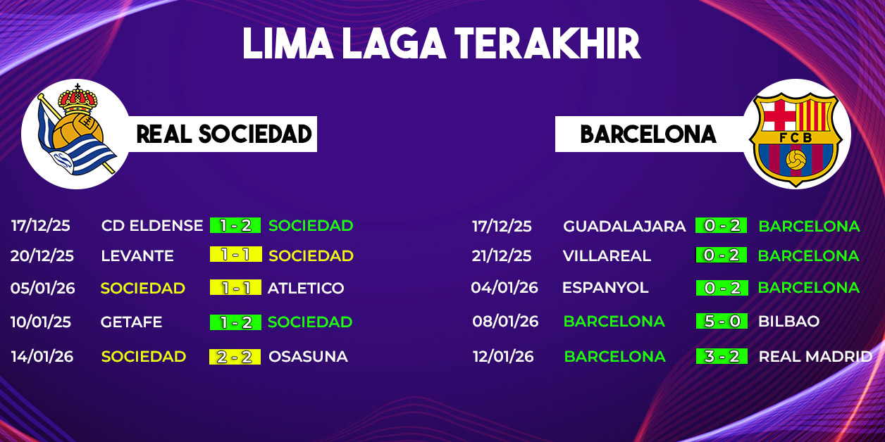 Duel Real Sociedad vs Barcelona di pekan ke-20 La Liga 2025/2026 menjadi laga penting bagi kedua tim. Barcelona ingin menjaga jarak di puncak klasemen dan melanjutkan tren kemenangan, sementara Real Sociedad berambisi membuktikan kebangkitan mereka di bawah Matarazzo.