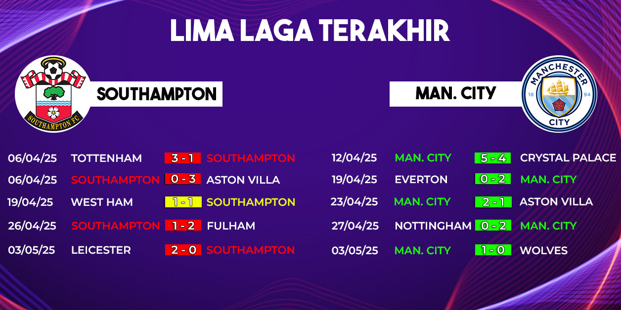 Dari 25 pertemuan terakhir melawan Southampton di liga, City hanya menelan tiga kekalahan—semuanya terjadi di St Mary's. Artinya, Southampton punya peluang kecil untuk menjegal dominasi City, meski tetap harus diwaspadai sebagai tuan rumah.