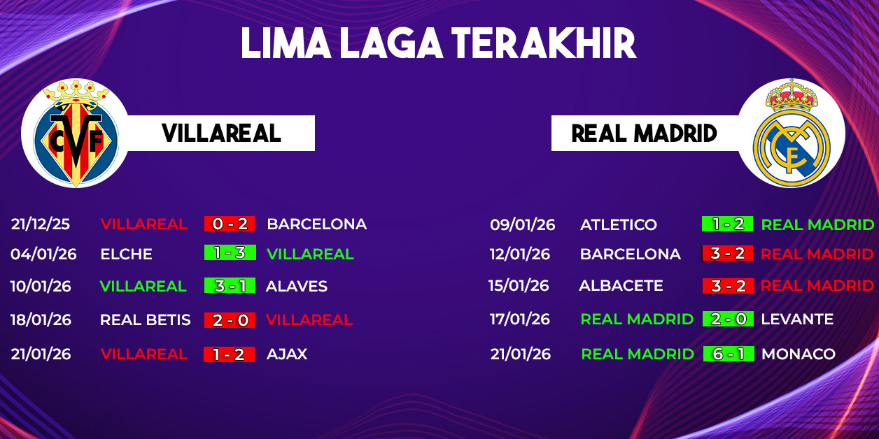 Pertandingan Villarreal vs Real Madrid pada pekan ke-21 La Liga 2025/2026 menjanjikan tensi tinggi dan kualitas permainan kelas atas. Villarreal berambisi bangkit dan menjaga posisi di papan atas, sementara Real Madrid ingin melanjutkan tren positif demi perburuan gelar juara.